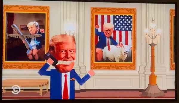 South Park creators Matt Parker and Trey Stone are also having a moment. One of my favorite parts of the show’s season premiere was the artwork around the White House: a Caesar-esque BIG DUMP portrait with a micropenis. One of HIM riding a tank. And others of HIM making love to a military plane, a glory hole, and a sheep. These background elements were masterpieces set in gaudy gold frames.
